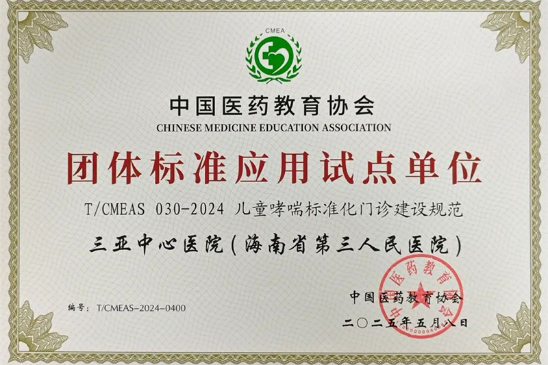 5月27日,据三亚中心医院(海南省第三人民医院)消息,该院儿科近日通过中国医药教育协会评审,获批成为国家级《儿童哮喘标准化门诊建设规范》团体标准应用试点单位。这一认证标志着三亚中心医院在儿童哮喘规范化诊疗领域迈入全国先进行列,将为琼南地区哮喘患儿提供更精准、系统的医疗服务。