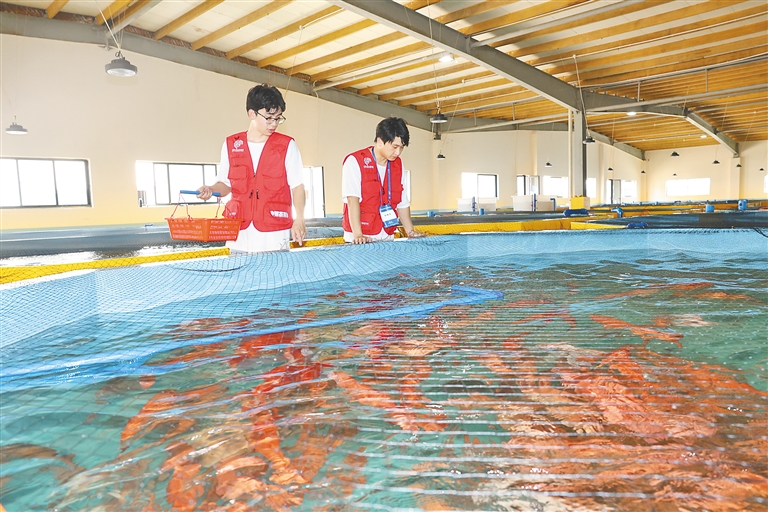 5月29日,在海南文昌石斑鱼科技小院内,两名研究生正在对养殖石斑鱼进行观测。该科技小院由海南大学与海南鲲诚环保科技有限公司联合共建,围绕石斑鱼种苗繁育、病害防控、生态养殖等关键技术展开攻关。海南日报全媒体记者 周达延 摄
