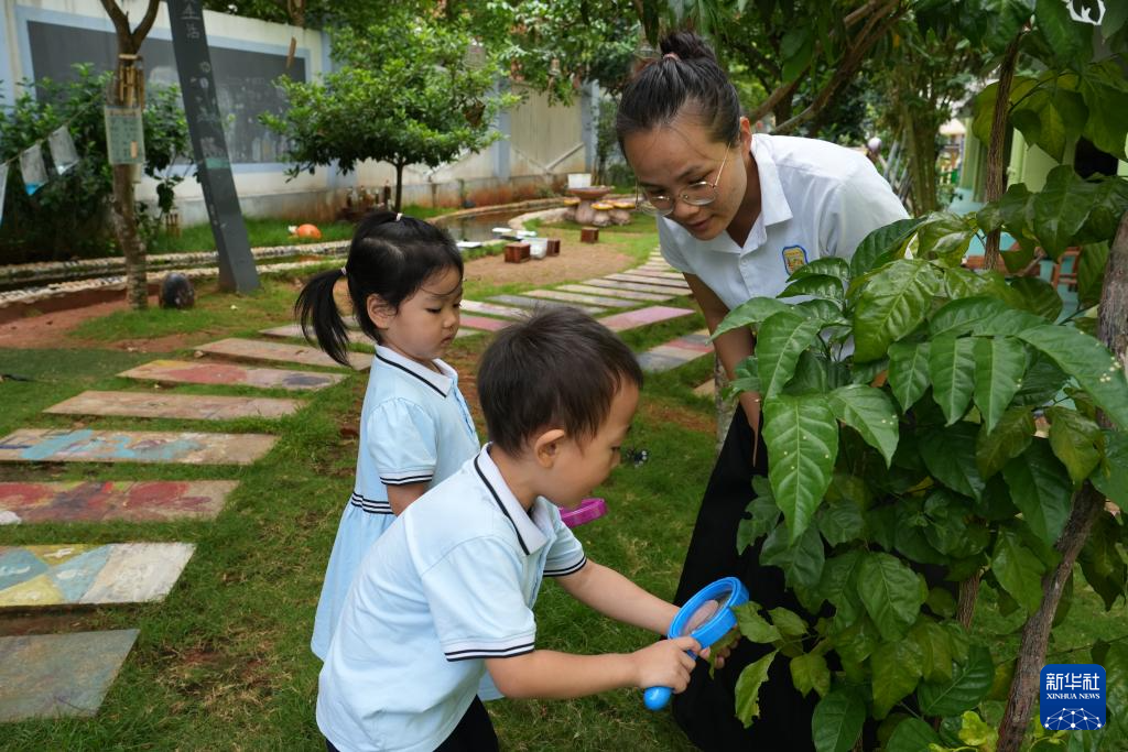 这是海口市教育幼儿园的户外游戏区,幼儿们正在观察植物。新华社记者 夏天摄