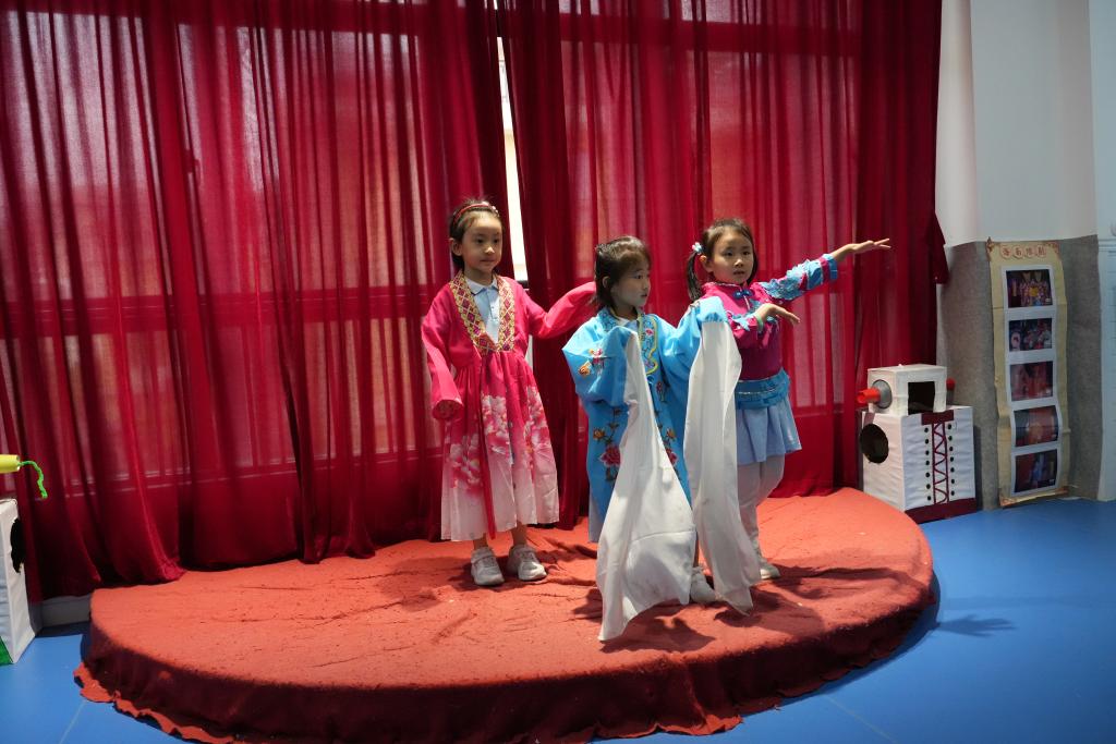 在海口市教育幼儿园“骑楼老街”微缩景观游戏区,幼儿们正在戏台上模仿表演琼剧。新华社记者 夏天 摄
