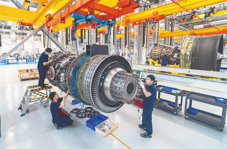 在海口空港综合保税区航空发动机维修基地,海口美兰空港吉耐斯航空发动机维修工程有限公司技术人员检查航空发动机。海南日报全媒体记者 袁琛 摄
