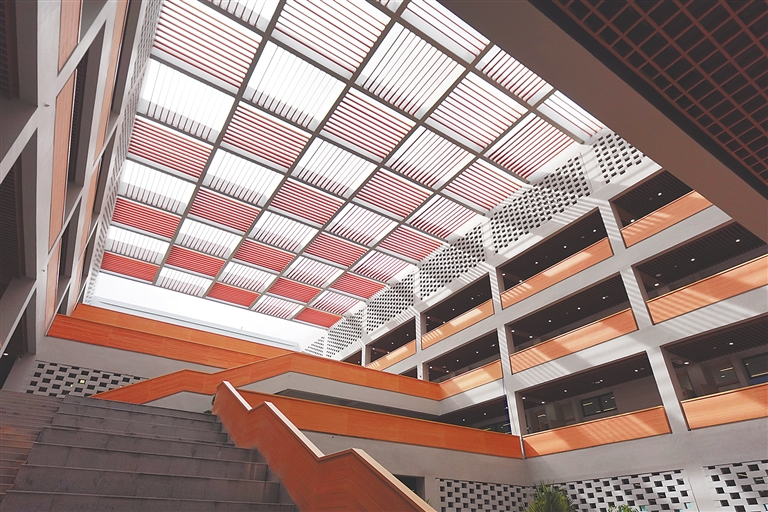 值得一提的是,教学楼构建起自然通风系统,为该校师生打开“天然空调”。走进比勒费尔德应用科学大学教学楼A栋,不难发现这是一个“处处通风”的建筑。看四面墙,砖块以镂空形式摆放,整面墙的孔洞为“穿堂风”留下宽阔的通道。抬头往上看,屋顶是横竖交错的铝格栅设计,形似拉开的百叶窗。“教学楼利用底层架空和内部开放中庭,形成‘烟囱效应’,增强自然通风,改善微气候,提升建筑的整体舒适度。”项目建设方、洋浦控股建设公司总经理罗鹏介绍,据测算,通过自然通风系统,夏季教学楼内的温度能比室外温度低约3至5摄氏度。