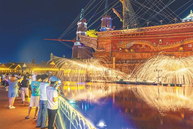 七月十八日,在海口长影环球100奇幻乐园,游客观看打铁花表演。海南日报全媒体记者 袁琛 摄