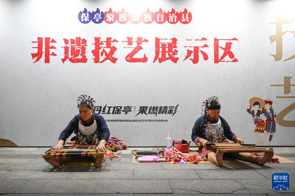 黎族织娘在海南保亭红毛丹文化节上展示黎族织锦技艺(7月12日摄)。新华社记者 蒲晓旭 摄