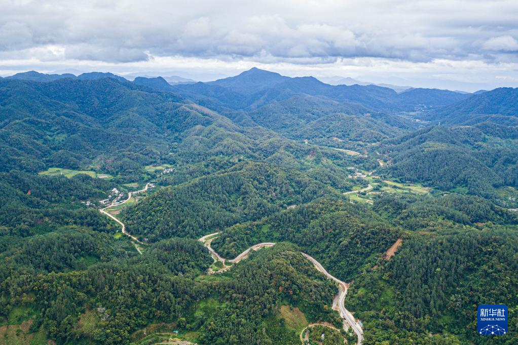 在海南保亭毛感乡拍摄的热带雨林及蜿蜒其中的环热带雨林国家公园旅游公路(无人机照片,7月22日摄)。新华社记者 蒲晓旭 摄