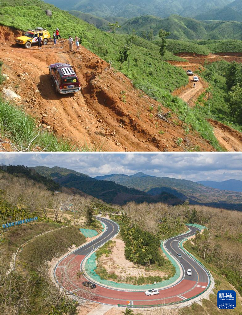 这是一张拼版照片。上图:海南省汽车越野运动协会组织越野车队从海南陵水黎族自治县出发,历时2天,在热带雨林中穿行150多公里,经海南保亭县、五指山市,由东向西成功穿越了五指山山脉(2004年5月30日摄,新华社记者姜恩宇摄);下图:车辆行驶在环热带雨林国家公园旅游公路保亭段(2025年1月30日摄,新华社记者蒲晓旭摄)。新华社发