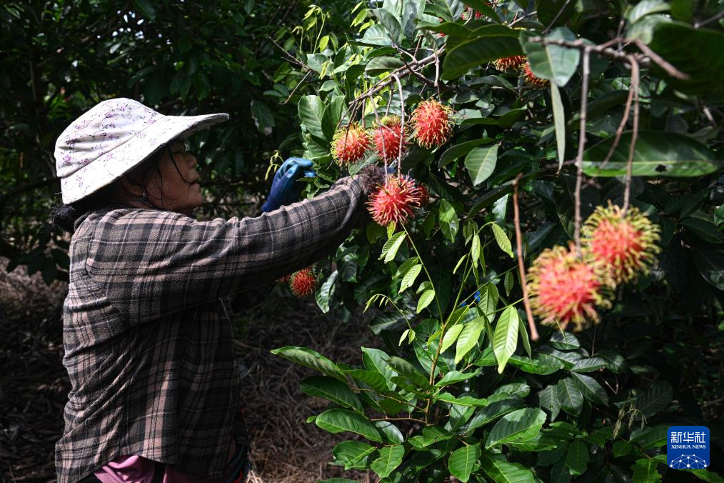 农民在海南保亭采收红毛丹(7月14日摄)。红毛丹是保亭热带特色高效农业的一张靓丽名片。新华社记者 蒲晓旭 摄