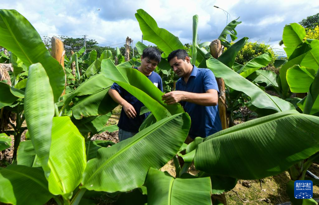 7月29日,瓦西姆·拉扎(右)在海南三亚崖州湾科技城香蕉试验田内查看香蕉。新华社记者 杨冠宇 摄