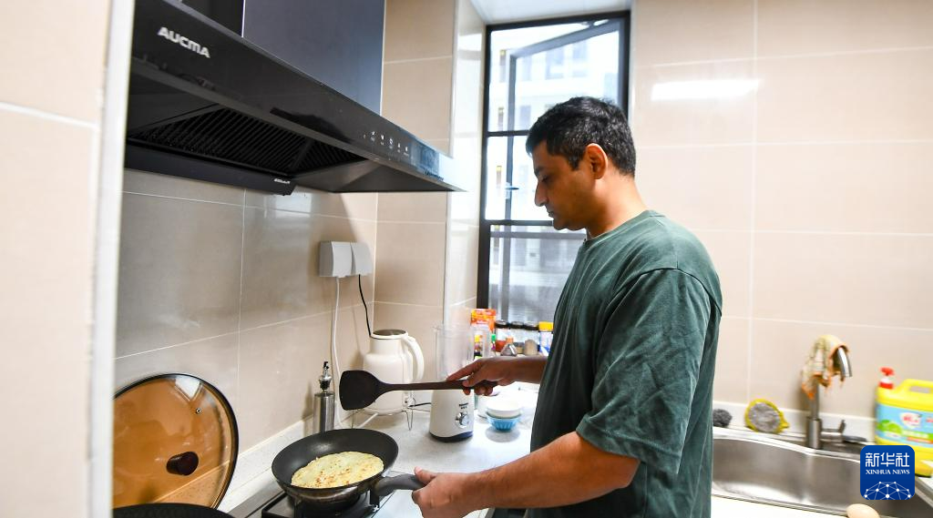 7月29日,瓦西姆·拉扎在公寓内做饭。新华社记者 杨冠宇 摄