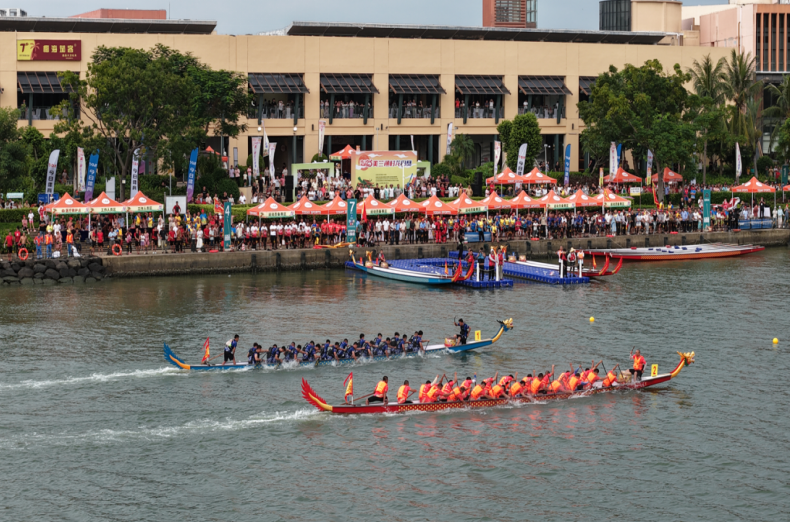 赛事首场周赛于16时30分火热开桨。随着发令枪响,6支参赛队伍劈波斩浪,展开激烈角逐。参赛队伍主要由海口本地渔民、职工和高校学生组成,虽为业余队伍,但竞技气势十足。200米直道上,龙舟如离弦之箭,桨叶翻飞,水花四溅,岸边的鼓声、呐喊声交织沸腾,现场气氛热烈。市民朋友早早守候在岸边,近距离感受水上竞速的魅力。