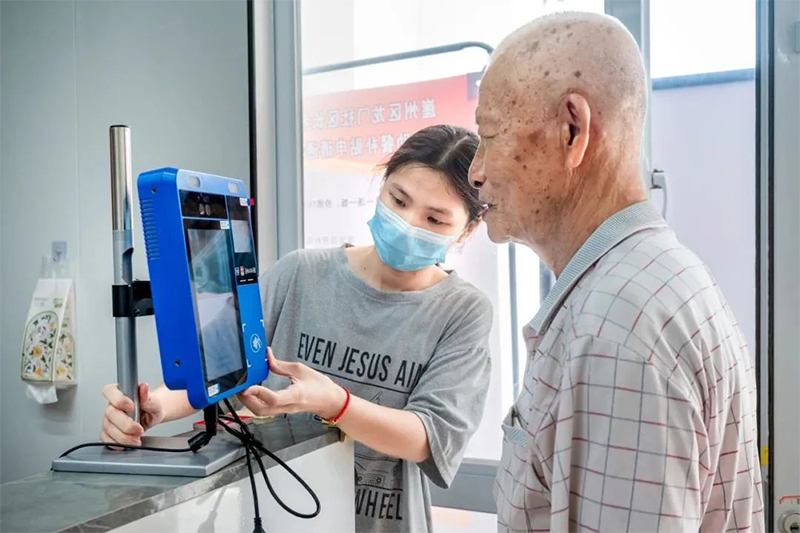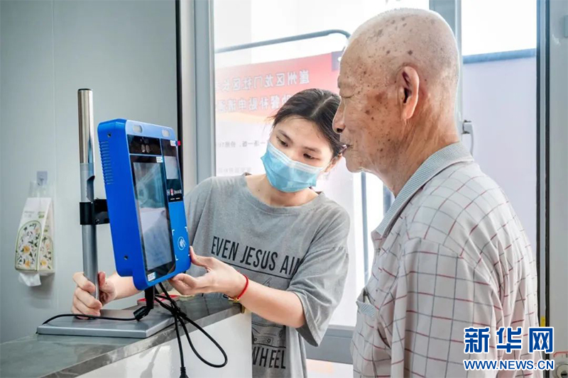 老年人在工作人员的引导下通过人脸识别完成就餐结算。新华网发