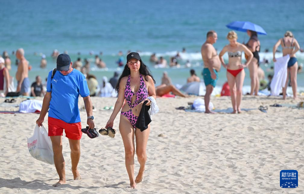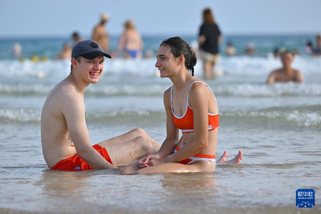 8月8日,外国游客在三亚大东海游玩。新华社记者 郭程 摄