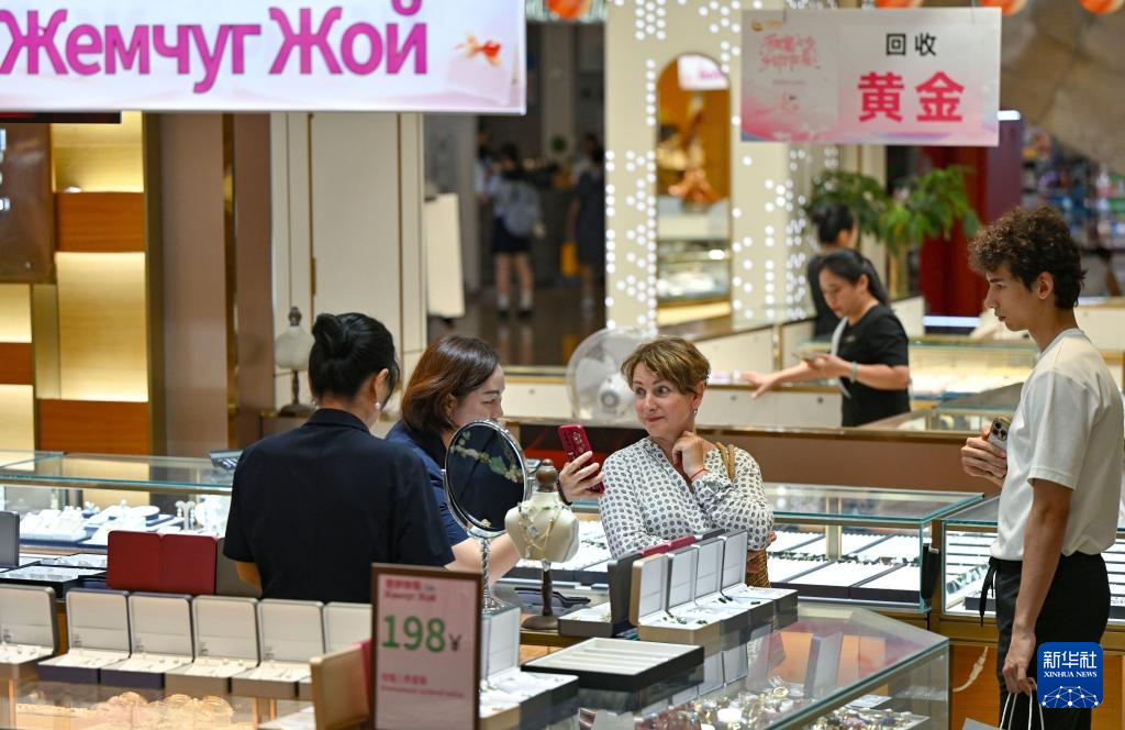8月8日,外国游客在三亚一家商场购物。新华社记者 郭程 摄