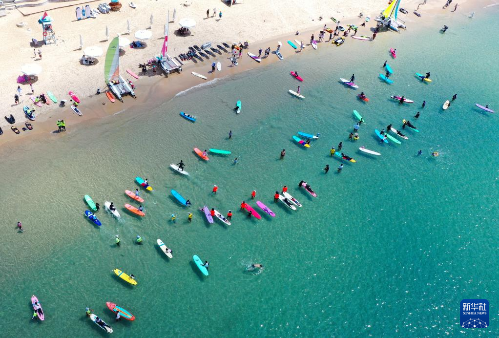 8月9日,游客在三亚市后海村附近海域冲浪嬉水(无人机照片)。