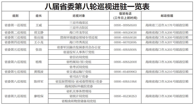 按照省委关于巡视工作统一部署,截至8月11日,八届省委第八轮巡视完成进驻工作。9个省委巡视组将对海口市秀英区、龙华区,三亚市海棠区、吉阳区,省委军民融合发展委员会办公室、省机关事务管理局、省司法厅党委、省交通运输厅党组、省退役军人事务厅党组、省统计局党组、省信访局党组、省粮食和物资储备局党组、省监狱管理局(戒毒管理局)党委、省档案局党组、省考试局党组、海南国际仲裁院党委等16家党组织开展常规巡视,并对海口市秀英区、龙华区,三亚市海棠区、吉阳区等4个区各2个行政村党组织开展提级巡视。首次对营商环境建设领域开展专项巡视。