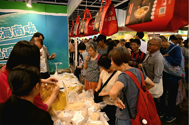 今年海南展团以“美味海南农品荟”为主题,展区面积扩容至108平方米,16家优质企业组团参展,创下历届规模之最。展台设计独具匠心,巧妙融入香港本地元素,通过“超正海南味 食过返寻味”“海南嘅嘢,真係好好食!”等走心宣传语,拉近与香港市民的情感距离。