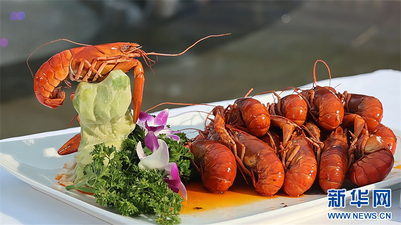 2025年8月6日,“海南鲜品”走进三亚湾美食推介会暨“天涯贡此食”新品发布会上,展出红螯螯虾制成的龙虾菜品。新华网发(孙才植 摄)