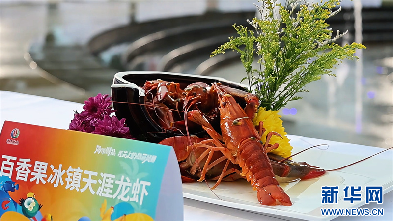 2025年8月6日,“海南鲜品”走进三亚湾美食推介会暨“天涯贡此食”新品发布会上,展出百香果冰镇天涯龙虾。新华网发(孙才植 摄)