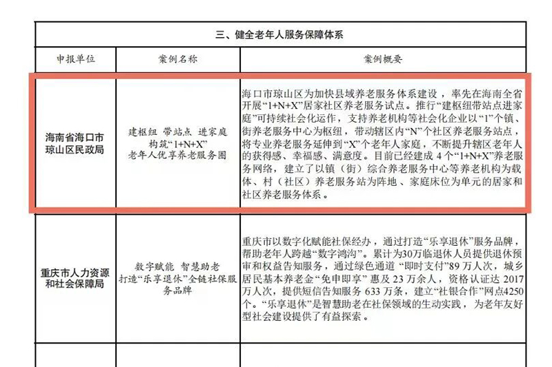 近日,全国老龄工作委员会办公室发布2025年老年友好型社会建设典型案例通知,公布全国共94个入选的典型案例。其中,海南省海口市琼山区民政局申报的《建枢纽 带站点 进家庭构筑“1+N+X”老年人优享养老服务圈》案例凭借创新模式与显著成效成功入选,为全国老年友好型社会建设提供了可复制的实践经验。