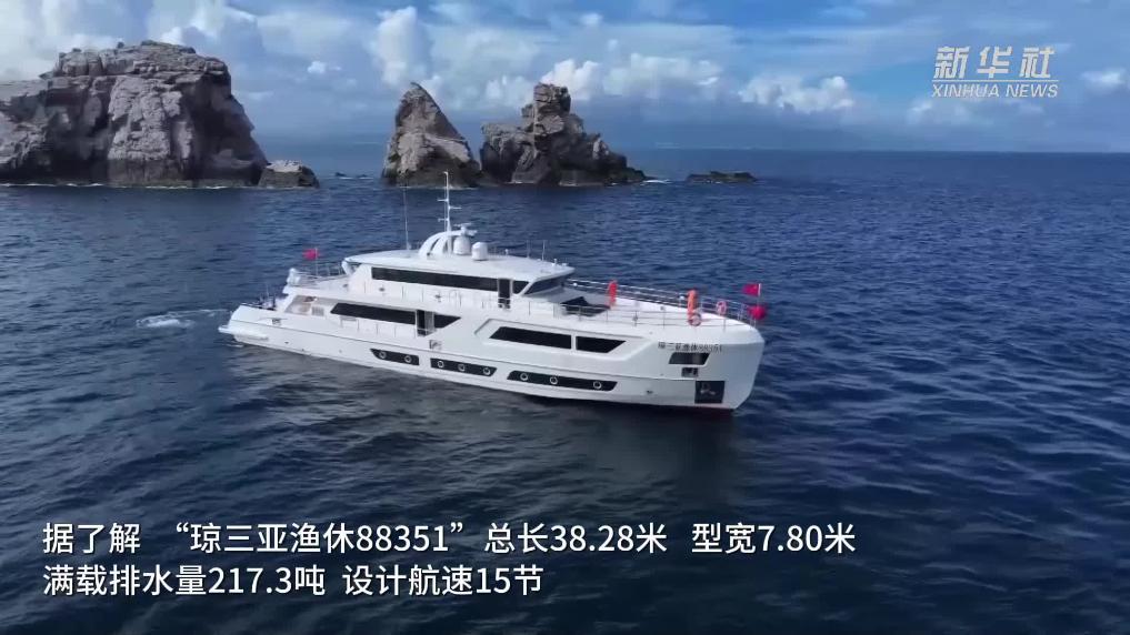 据了解,“琼三亚渔休88351”总长38.28米,型宽7.80米,满载排水量217.3吨,设计航速15节,船体采用横骨架式玻璃钢结构,不仅耐腐蚀性强、自重轻,还集成了垂钓、商务接待及团队活动等多元功能。